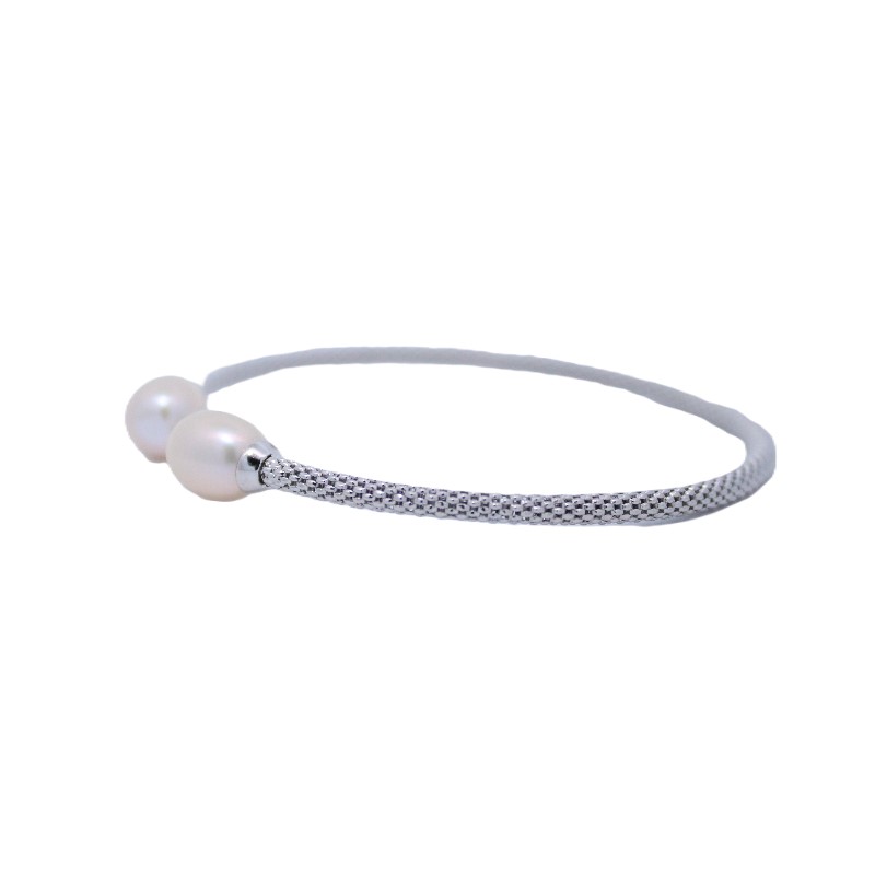 Sterling silver mesh design cuff bracelet with 2 pearl endcaps.