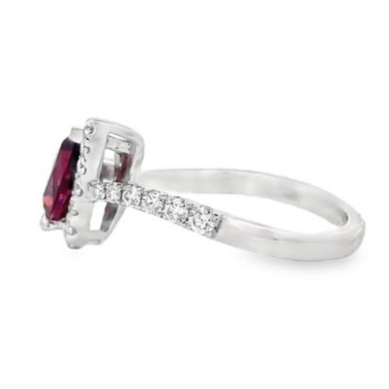 1 pear shaped garnet is prong set in the center of the 18 karat white gold ring and partially surrounded by a halfway diamond halo with graduated full cut diamonds halfway down each side of the shank.