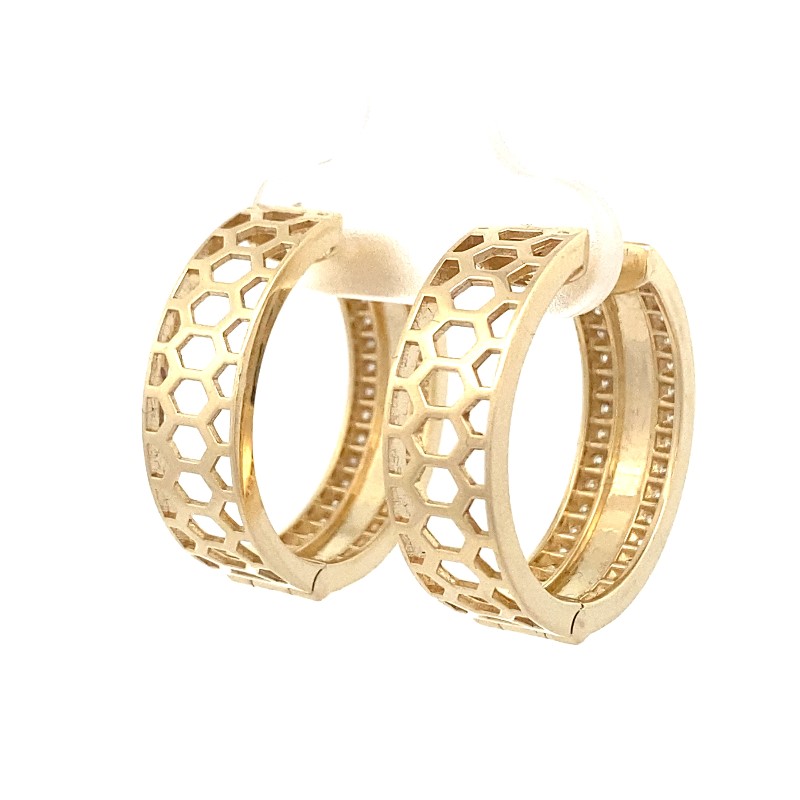Each14 karat yellow gold earring contains 17 full cut diamonds on each outer edge in the front section of the polished hoop with a cutout honeycomb design in the back section. The 68 diamonds have a total combined weight of.4