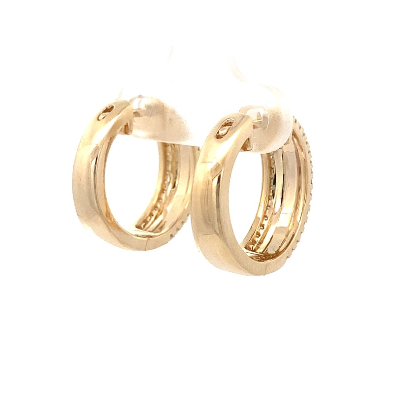 Each 14 karat yellow gold earring contains 16 single cut diamonds on each outer edge of the polished hoop. The 64 diamonds have a total combined weight of 0.46 carat and are graded H-I for color and SI2-I1 for clarity.