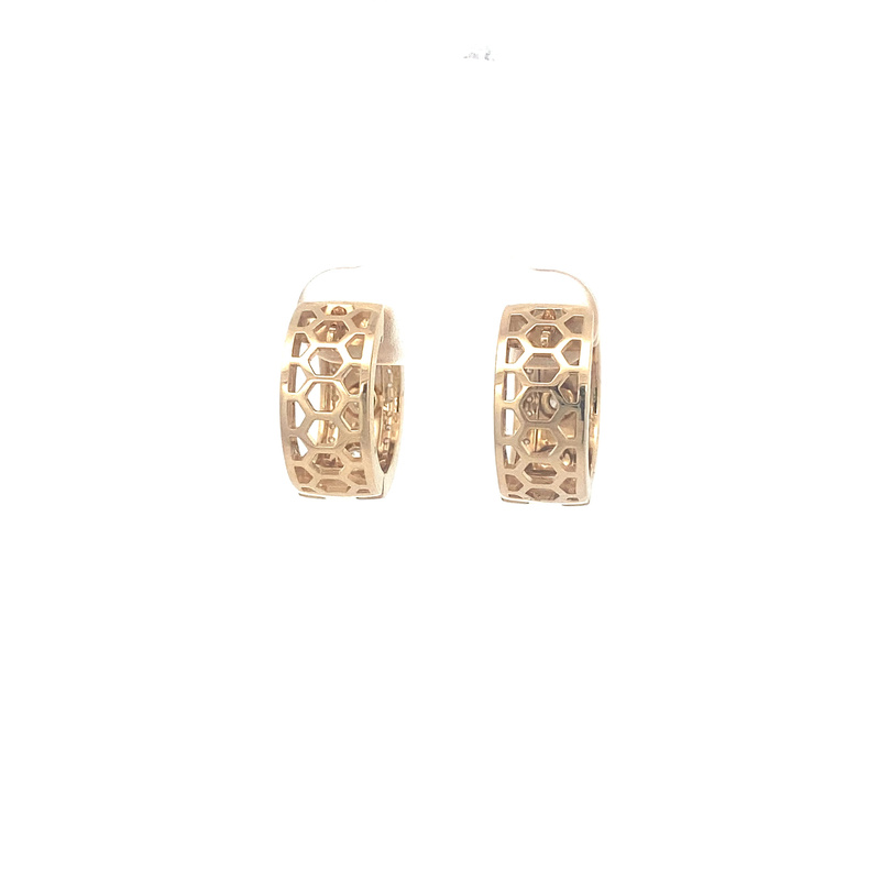 Each 14 karat yellow gold earring contains 3 full cut diamonds in the center with13 single cut diamonds on each outer edge in the front section of the polished hoop and a cutout honeycomb design in the back section. The 58 di