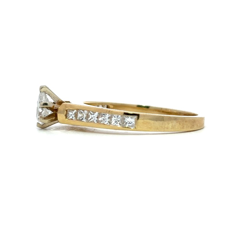The 18 karat yellow gold ring contains one pear shape prong set diamond mounted in the center 0.32ct I1-G with 6 princess cut channel set diamonds mounted on either side of the center. Side diamonds have a total weight of 0.47ct S
