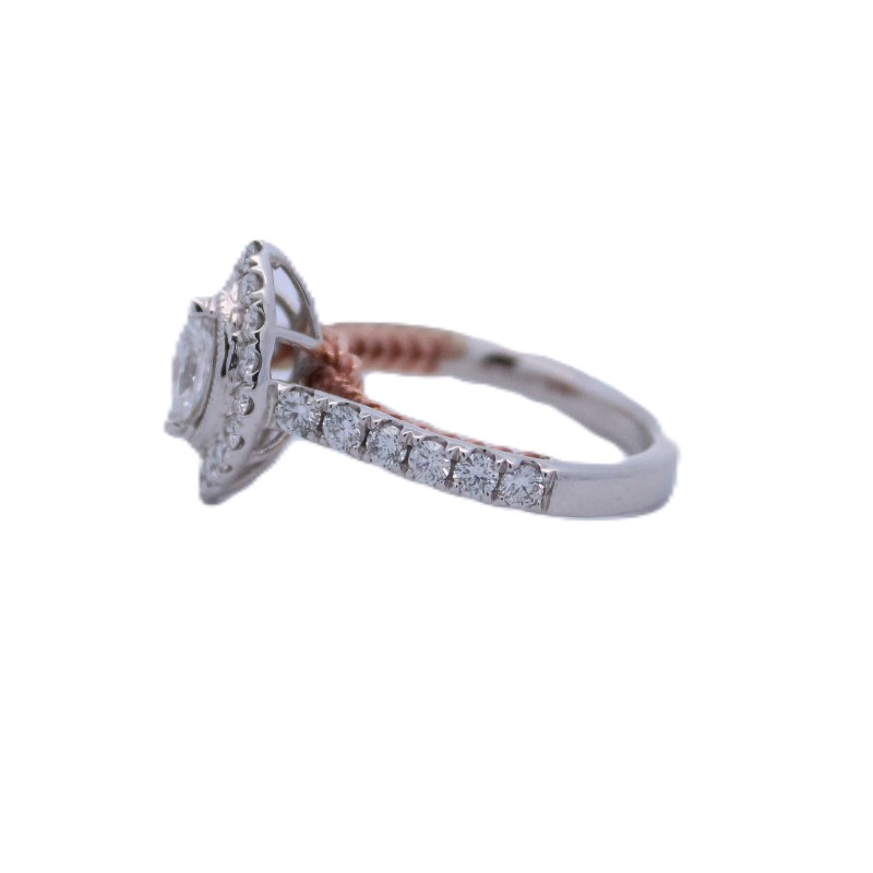 The 14 karat white and rose gold ring contains 1 marquise cut diamond in the center weighing 0.38 carat graded I-J color and SI2-I1 for clarity surrounded by 16 full cut pave set diamonds with a milgrain edge. Th