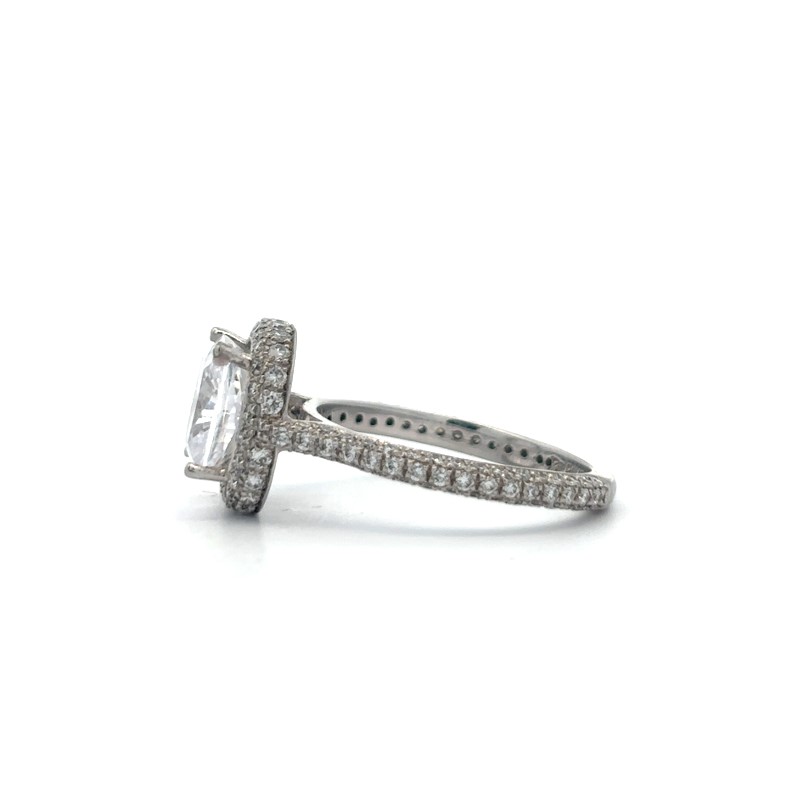 The ring contains a raised square 4-prong center section for a square cushion cut stone. There are a total of 140 full cut diamonds pave set around the center section and on both sides of