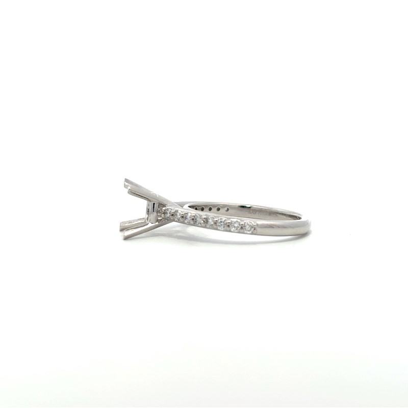 The ring contains a 4 prong head for a round stone having 8 full cut prong set diamonds in either side of the shank. The 16 diamonds have a total weight of .32 carat and are graded G-H for color and SI1-SI2 for clarity.