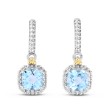 Each 18 karat yellow gold & sterling silver earring contains 5mm cushion light swiss blue topaz