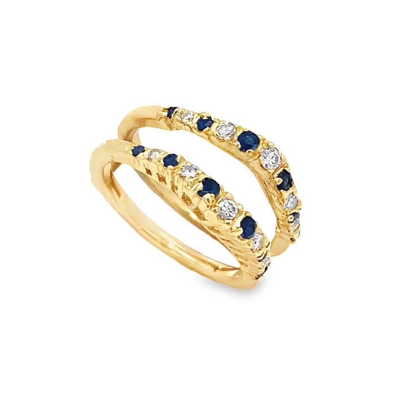 The 14 karat yellow gold ring contains 6 round cut sapphire alternating with 5 full cut diamonds prong set on either side. 10 diamonds have a total weight of approximately 0.25 carat H-I SI1-2. 3.48dwt. Size 6.