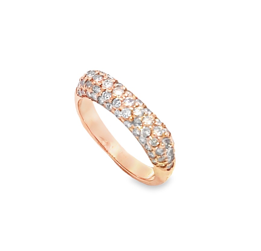 The 14 karat rose gold ring contains 70 full cut diamonds pave set in 5 rows across the top section. The 70 diamonds have a total weight of approximately 1.0 carats and are graded H-I for color and SI1-2 for clarity. Size 7