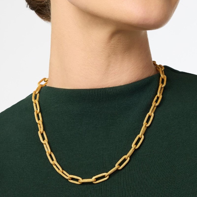Elongated oval links textured with braided golden wire closing with a matching toggle. 24 karat gold plated. 18.8 - 20 inches adjustable.