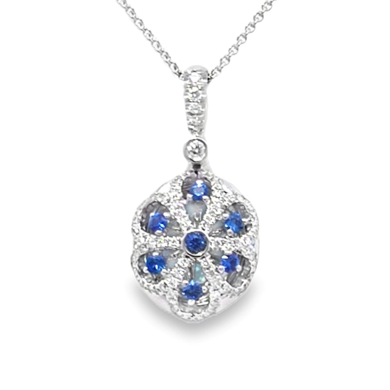 A stunning aquamarine is set in a sleek 18 karat white gold setting with brilliant white diamonds surround the center stone and set in the bail. The back of the pendant contains oval cutout designs