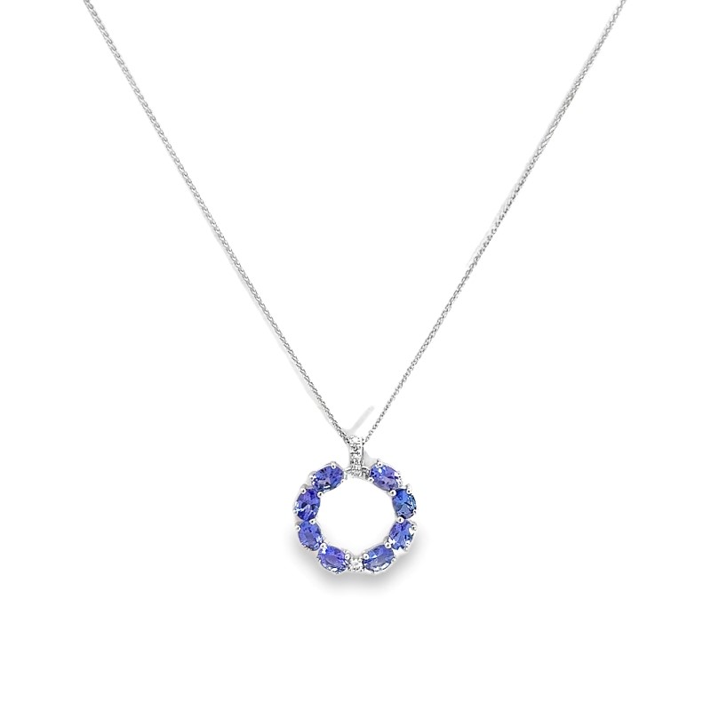 The14 karat white gold pendant contains 6 full cut diamonds pave set in the bail with a cutout circle dangle having 8 round cut tanzanite and 1 full cut diamond all prong set. The 8 tanzanite have a total w