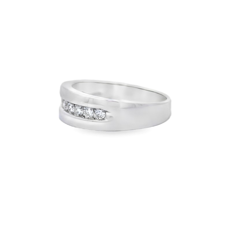 The 14 karat white gold ring is channel set with 9 full cut diamonds having a combined weight of 0.46 carat and graded H-I color and SI2-I1 for clarity. Size 10.5