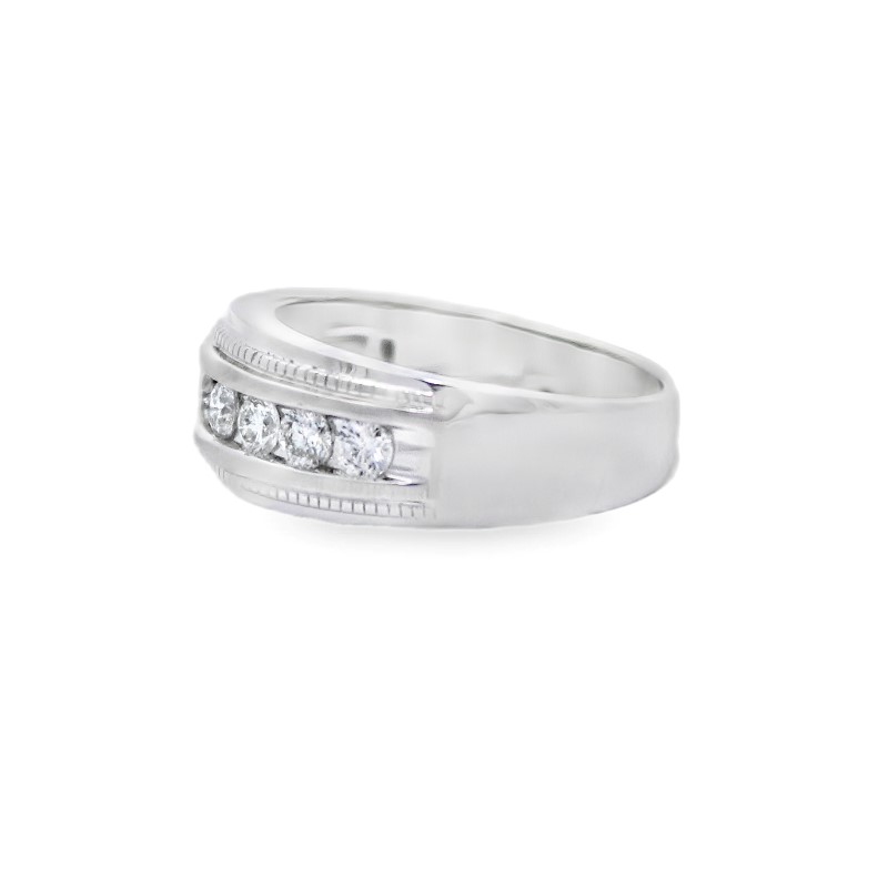 The 14 karat white gold ring is channel set with 9 full cut diamonds between a textured edge trim having a combined weight of 1.02 carats and graded H-I color and SI2-I1 for clarity. Size 10.5
