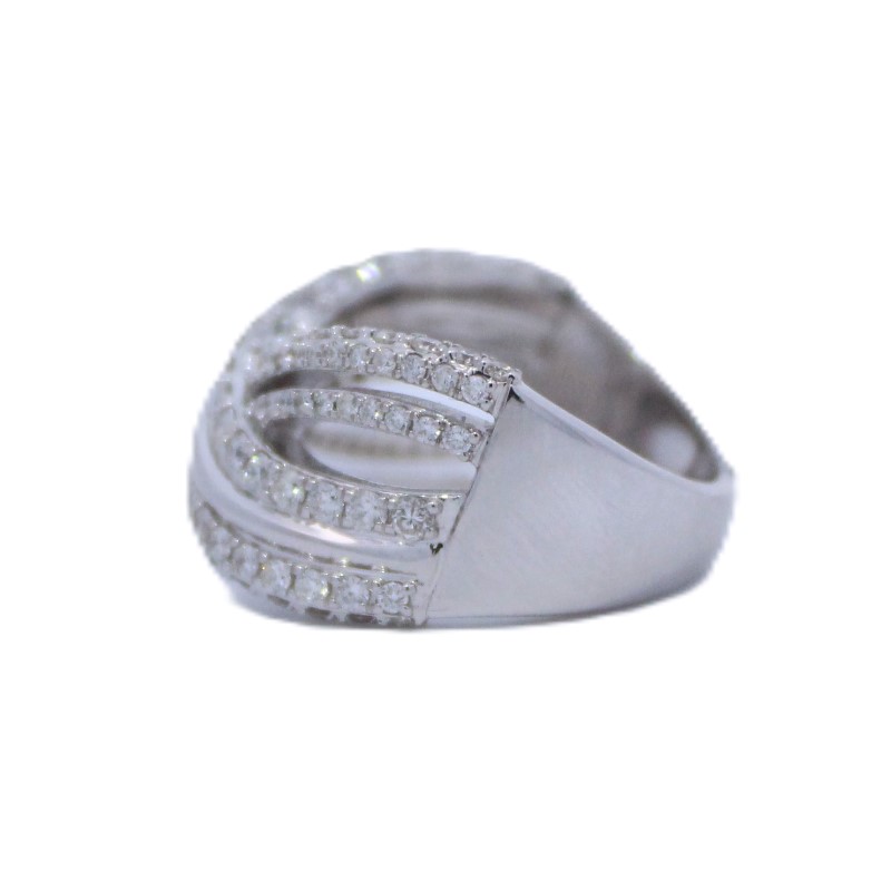 The 18 karat white gold ring contains a wide band design with an X design on top and is prong set with 159 full cut diamonds having a combined weight of 1.75 carats and graded I-J color and I1 for clarity. Size 7.