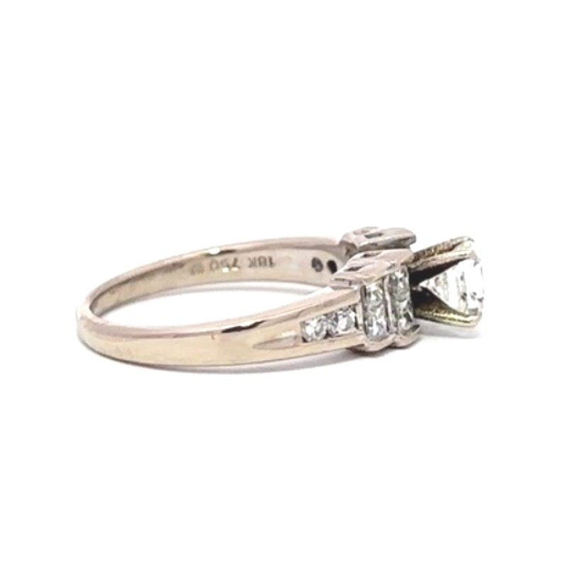 The 18 karat white gold ring contains 1 princess cut prong set diamond in the center with an approximate weight of 0.52 carat and graded I1 for clarity and H for color with 4 princess cut and 2 full cut diamonds channel set