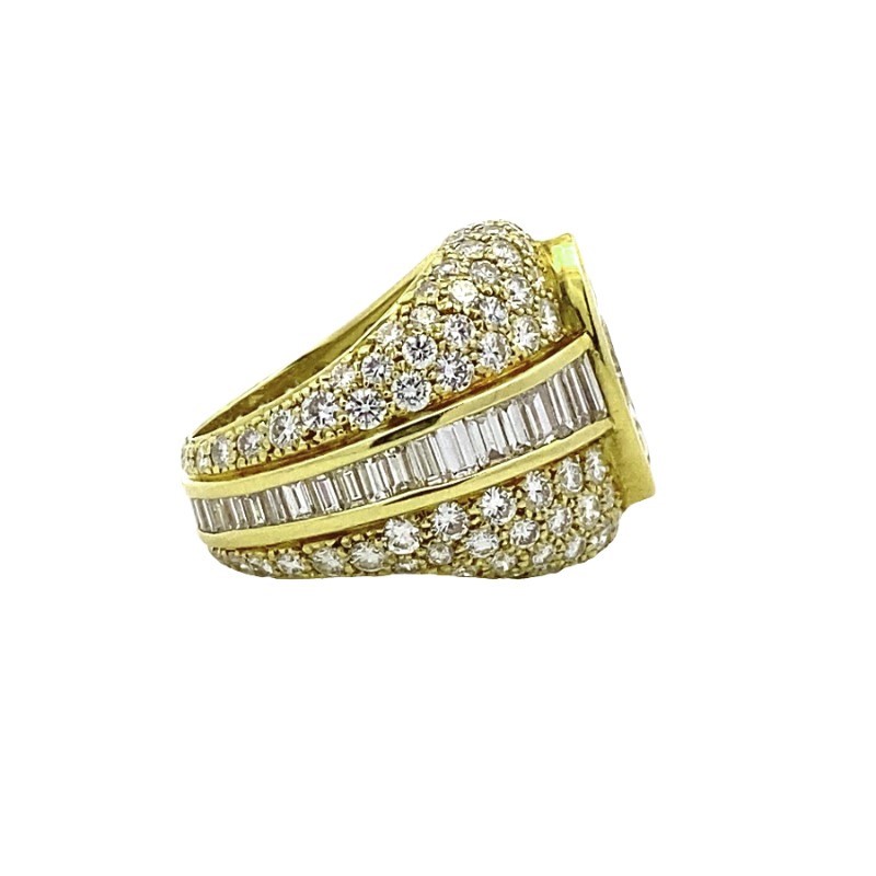 Bezel set in the center of the 18 karat yellow gold ring is one marquise cut diamond weighing approximately 2.25 carats. channel set around the entire center of the band are 45 straight baguette cut diamonds set eternally. Each s