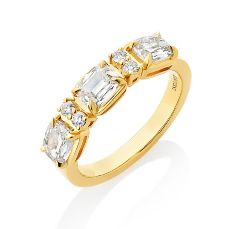 The 14 karat yellow gold ring is prong set with 3 cushion cut diamonds and 4 full cut diamonds. 3 cushion cut diamonds have a combined weight of 0.88 carat and are graded H color and VS2 for clarity and 4 full cut diamonds have