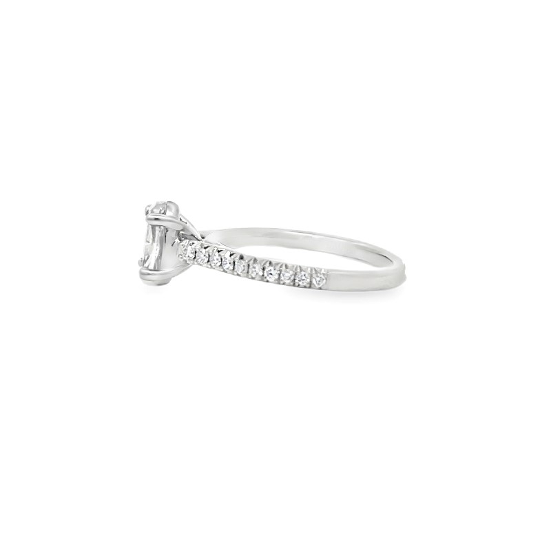 The 18 karat white gold ring is prong set in the center with 1 GIA certified oval diamond weighing 0.91 carat and graded E color and SI1 for clarity with 10 full cut diamonds pave set on either side. The 20 f