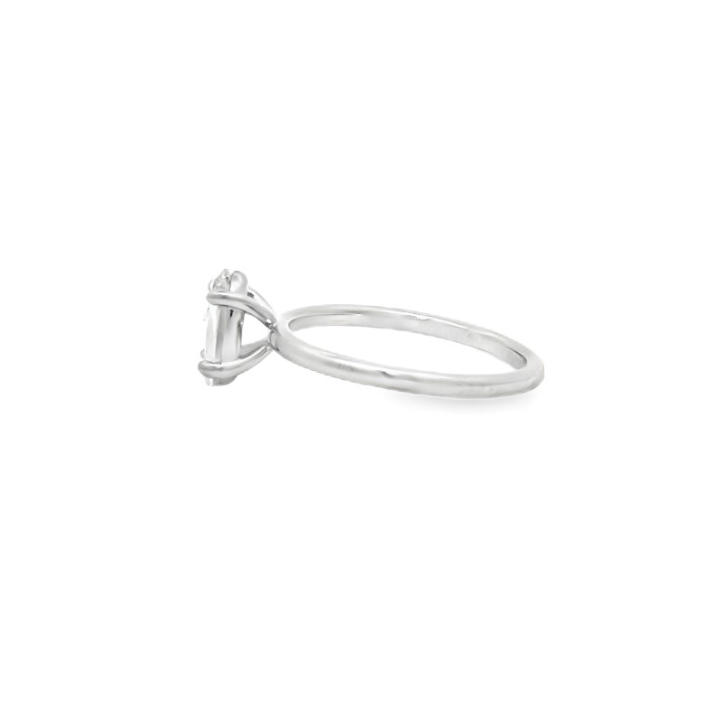 The 18 karat white gold ring is prong set with 1 oval faceted diamond in the center weighing 0.80 carat and graded G color and SI1 for clarity. Size 6.25.