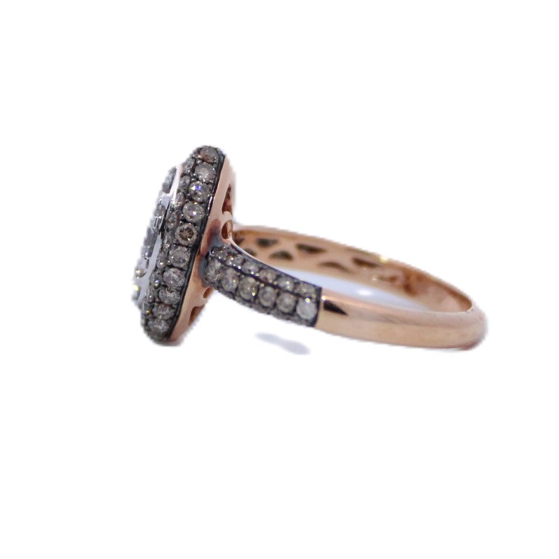 The 18 karat rose gold ring contains a cluster of 10 full cut white diamonds graded J color prong and invisibly set in the center surrounded by 44 full cut pave set cognac diamonds with 18 full cut cognac diamo