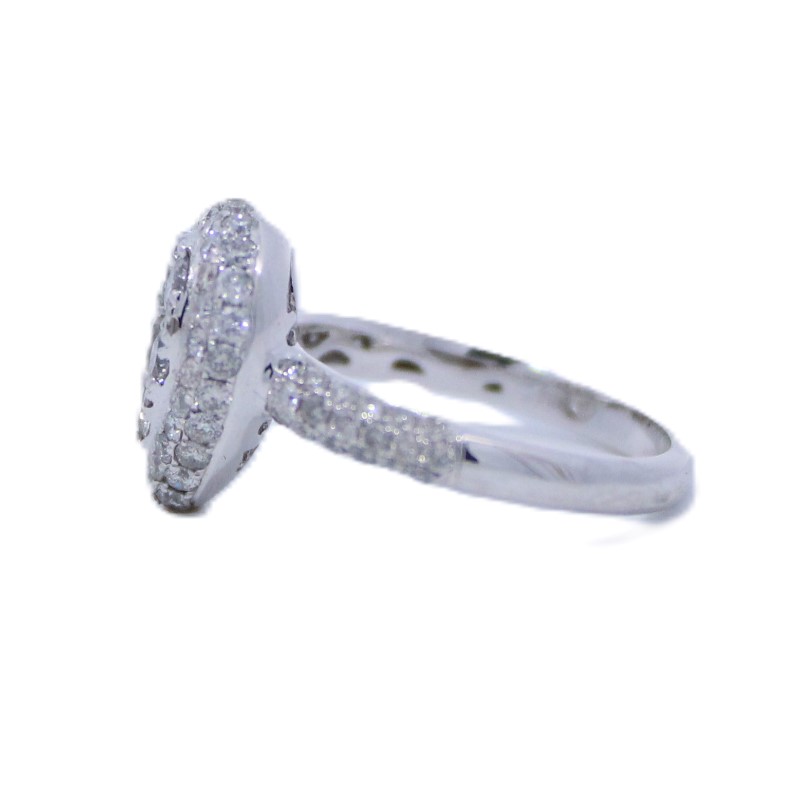 The 18 karat white gold ring contains a cluster of 11 full cut diamonds prong and invisibly set in the center surrounded by 44 full cut pave set diamonds with 18 full cut diamonds pave set in each side of the shank. 91 di