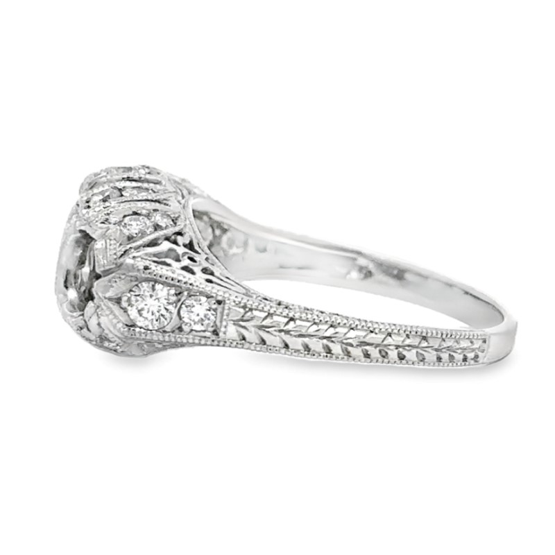 The ring has 22 full cut prong set diamonds surrounding the entire center section with a hand engraved shank and milgrain edge finish. Size 6.75.