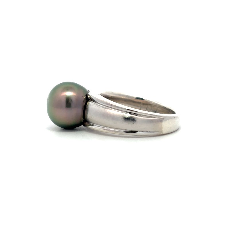 The ring contains 1 10 x 11 mm pearl having a dome shaped shank with grooved edges. Size 6.5.