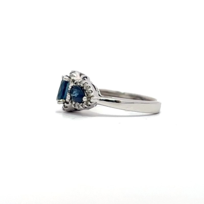 4 prong set in the center of the 14 karat white gold ring is one oval cut faceted blue sapphire surrounded by 20 full cut diamonds. On either side is one pear cut faceted sapphire surrounded by 11 full cut diamonds all pro