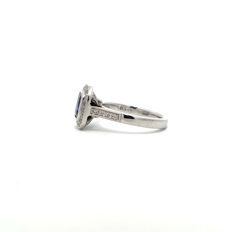 The 18 karat white gold ring is bezel set with 1 octagonal sapphire in the center surrounded by a halo of 20 pave set diamonds with 5 diamonds pave set on either side of the shank. The gallery contains 4 pave set diamonds a