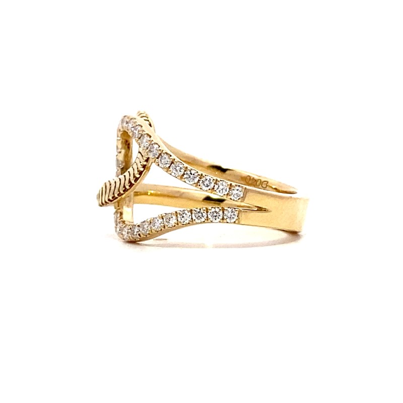 The 18 karat yellow gold ring contains 1 loop with a textured snake design interlocking with a 2nd loop prong set with 28 full cut diamonds weighing 0.40 carat I I1. Size 6.5