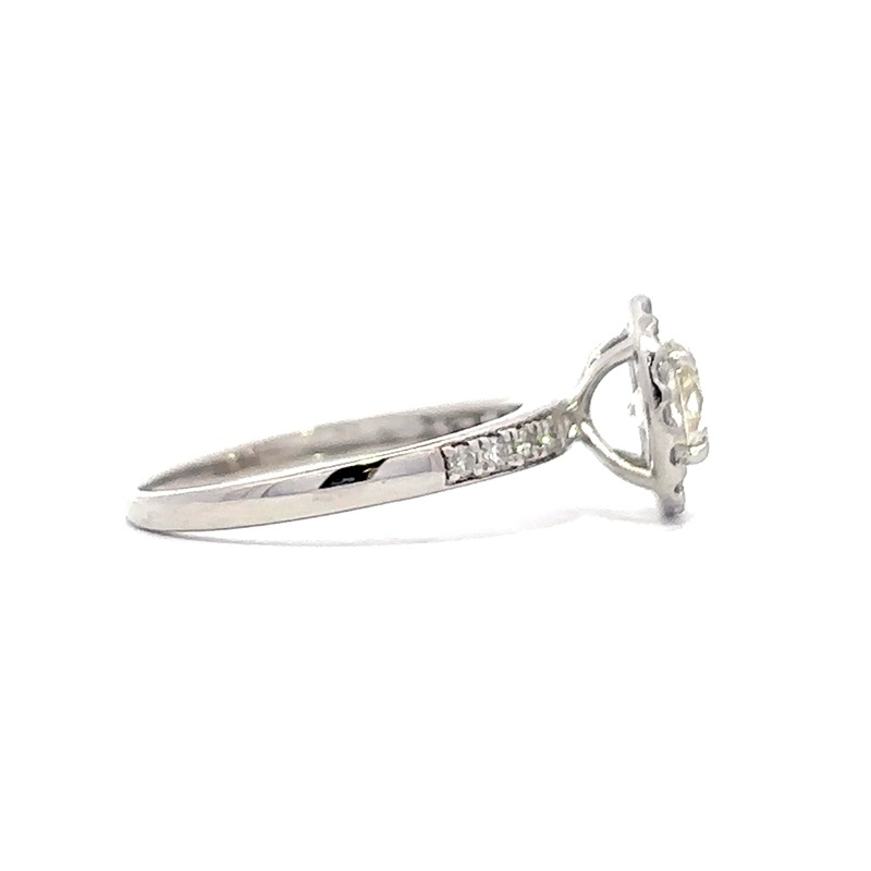 The 14 karat white gold ring contains 1 round brilliant diamond prong set in the center having a weight of approximately 0.69 carat surrounded by 16 full cut diamonds prong set. Mounted on either side of the center on