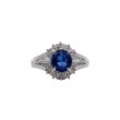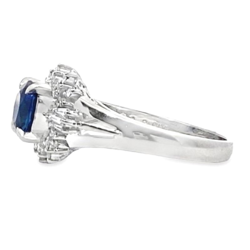 Four prong set in the center is 1 oval sapphire weighing 1.20 carats (stamped). Prong set on either side of the center are 3 tapered baguette cut diamonds with 11 full cut prong set diamonds set above and be