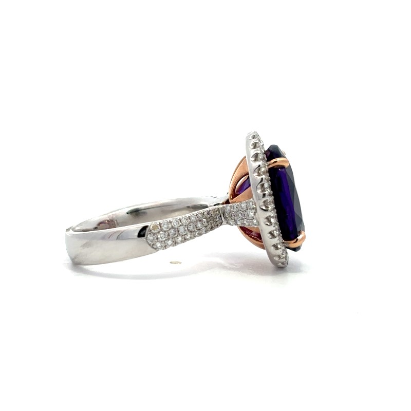 The 18 karat white and rose gold ring is prong set with 1 oval faceted 14 x 12mm amethyst in the center surrounded by a 27 full cut prong set diamond halo with 39 full cut diamonds pave set in 3 rows on either side of the s