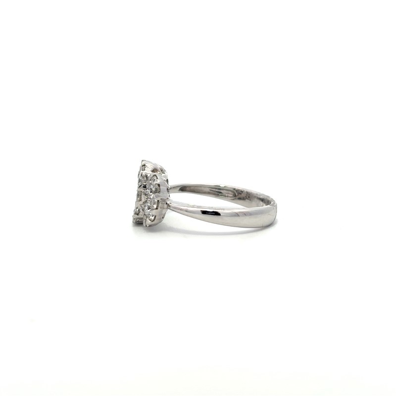 The 18 karat white gold ring contains 3 oval shaped pave diamond clusters in the center containing 32 full cut diamonds. 32 diamonds together weigh 1.23 carats and are graded F-G color and VS2 for clarity. Size 6.75