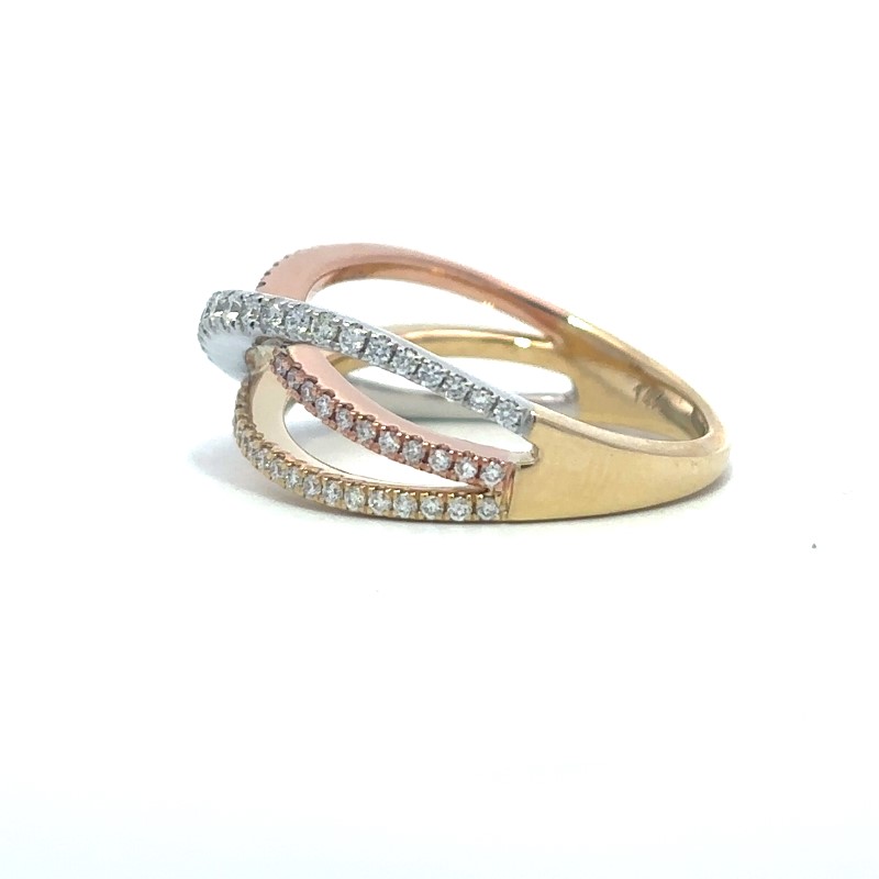The 14 karat tri-tone ring has 1 white gold diamond strand that crosses over 1 rose and 1 yellow gold diamond strand to form a cutout band that measures approximately 8mm at the widest points. 89 full cut diamonds hav
