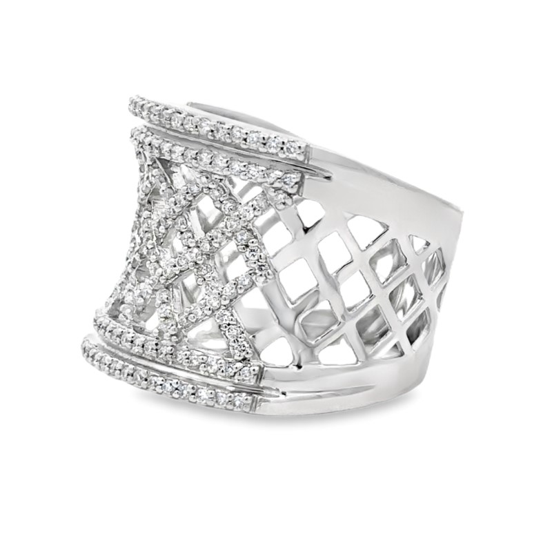 The 14 karat white gold ring contains 98 full cut diamonds pave set in a wide weave design with a double row of full cut pave set diamonds bordering each edge of the 17mm ring. 198 diamonds have a combined weight of 0.80 carat and