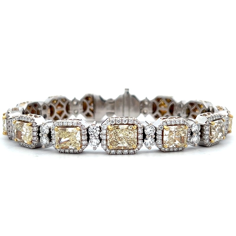 The 18 karat white gold bracelet contains 13 links each having 1 radiant cut pale yellow diamond 4 prong set in 18 karat yellow gold. Surrounding the center stone are 22 full cut prong set white diamonds w