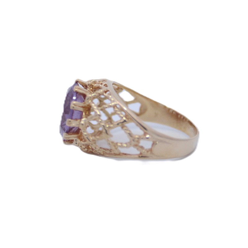 1 round faceted amethyst measuring approximately 12mm is prong set in the center of the 18 karat yellow gold lattice design ring. Size 7.75. 4.33dwt