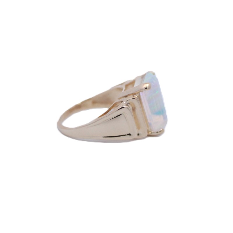 The 14 karat yellow gold ring contains a synthetic opal 13.5 x 5 mm approximately 2.50 carats. The ring has a double bar design on either side of the center stone. 3.6 dwt. Size 7.