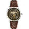 The Bulova x Stetson Longhorn watch brings two quintessential American heritage brands together to create an iconic timepiece that commemorates the founding of the John B. Stetson Company in 1865 through a collaboration steeped in heritage. On the dial, a gold-tone Texas Longhorn skull that symbolizes the enduring spirit of the West is set in relief against an ornate floral pattern inspired by the intricate decoration seen on traditional western wear. Echoing Stetson's legendary style and attention to detail, its silver-tone stainless steel case is elevated with a sapphire crystal and an onion crown with a black onyx cabochon. The automatic 21-jewel movement is visible through an open case back, which is printed with a classic Stetson hat and encircled with a laurel wreath pattern. Finished with a brown western-style leather strap, the 160th Anniversary Longhorn watch, is both a fitting tribute to and a continuation of the brands' dual commitment to quality and craftsmanship.
