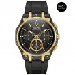 Discover new horizons with the boldest Bulova CURV yet, made in celebration of Bulova's historic 150th Anniversary. Daringly innovative, this new CURV features a case made from forged carbon infused with 97.97% pure  gold flake for a unique luster, appointed with a novel gold-tone stainless steel bezel attached with visible screws and creating striking contrast and eliciting the richness of the gold flake in the case. The process of creating the specialized forged carbon ensures that each case is unique in its patterning. A  dramatically curved sapphire crystal reveals a multilayered black dial with gold-tone accents, offering a glimpse at the revolutionary curved NR20 CURV high-precision quartz chronograph movement,  which is further revealed through the exhibition window in the gold-tone stainless steel case back. Completing the contemporary look, the watch is equipped with an HNBR premium rubber strap , with stylized comfort and a foldover buckle. Capturing modern style and cutting-edge technology, this new Bulova CURV brings an undeniable edge to any ensemble and reaffirms Bulova's place at the frontier of watchmaking.